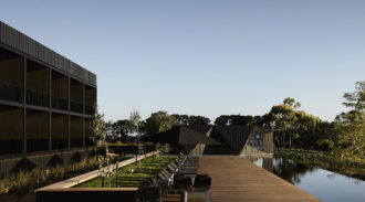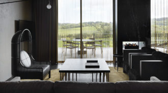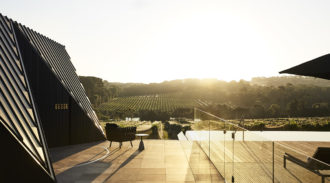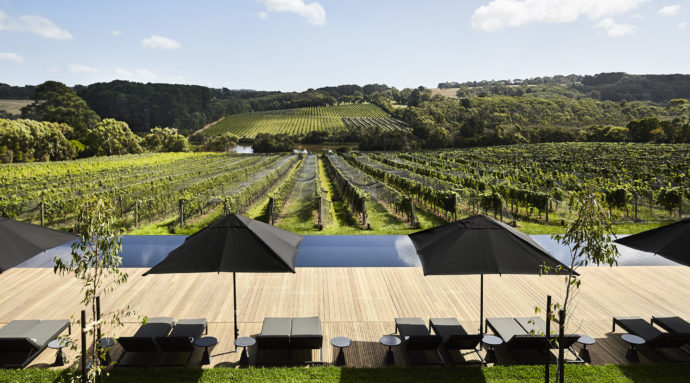 A stunning 30-metre black infinity pool with heated spa, showcasing a tranquil sightline from water to the vines beyond.